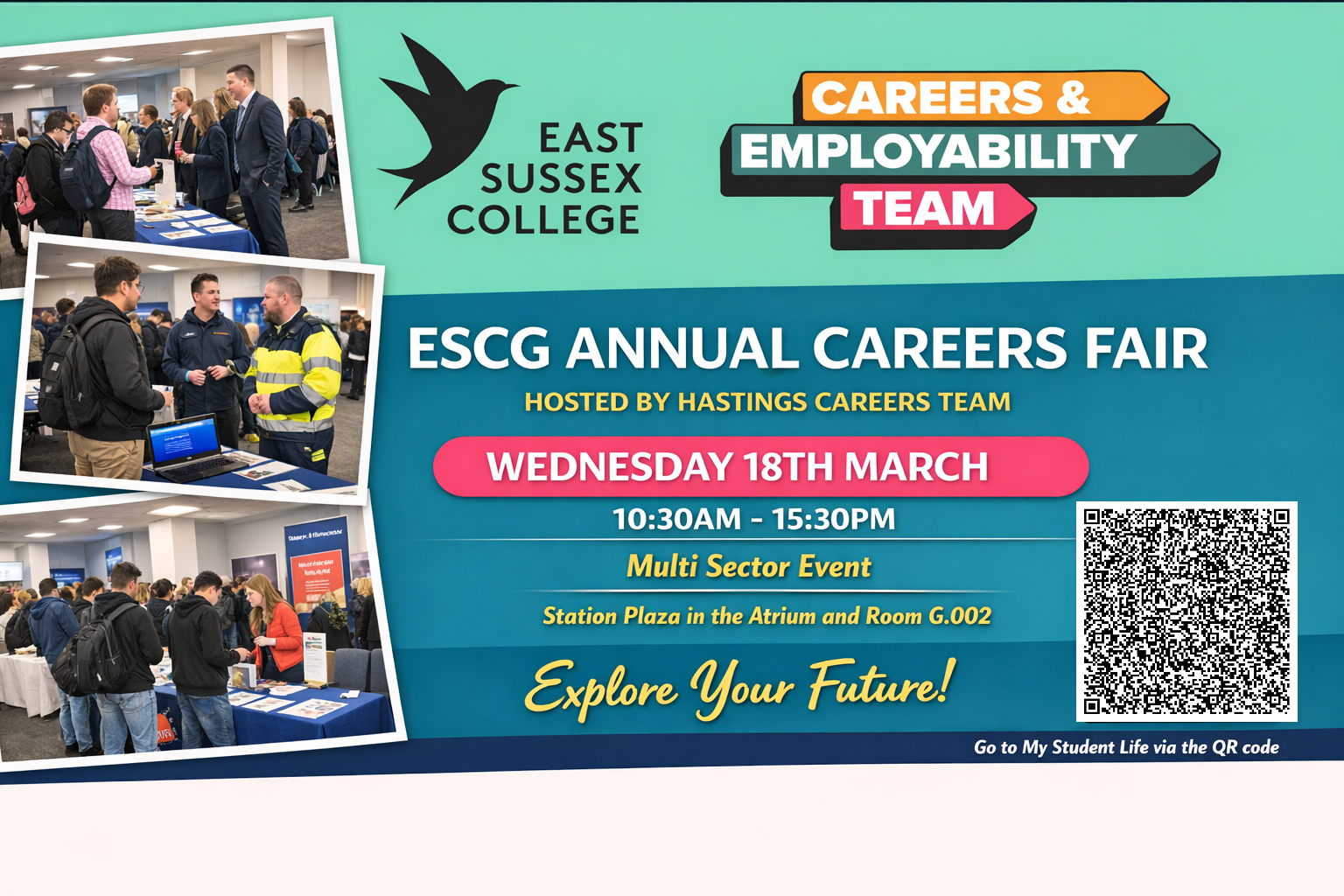 The Hastings Careers Team welcomes all ESCG students to attend the annual Careers Fair at Station Plaza, for an all day event. Come and meet over 35 employers, higher education providers, and charities to find out about careers in your chosen sectors. This counts towards your employer engagement activity. Don’t forget to bring your CV!