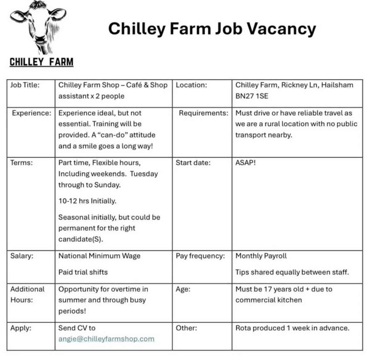 To Apply: Email your CV to angie@chilleyfarmshop.com