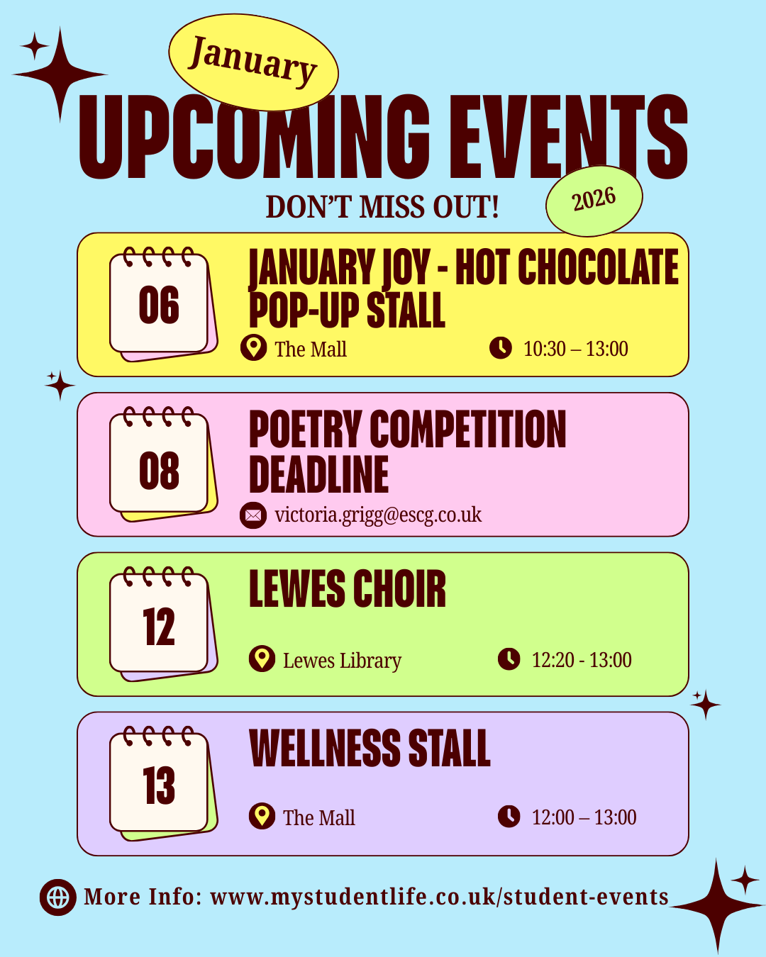 Beat the January blues with January Joy, a series of feel-good activities designed to boost wellbeing and bring people together. Enjoy a hot chocolate pop-up β, creative wellness stalls with crafts and pronoun badges π¨, an uplifting wellness choir πΆ, a poetry competition βοΈ and practical financial wellbeing workshops π· to help you start the year strong.